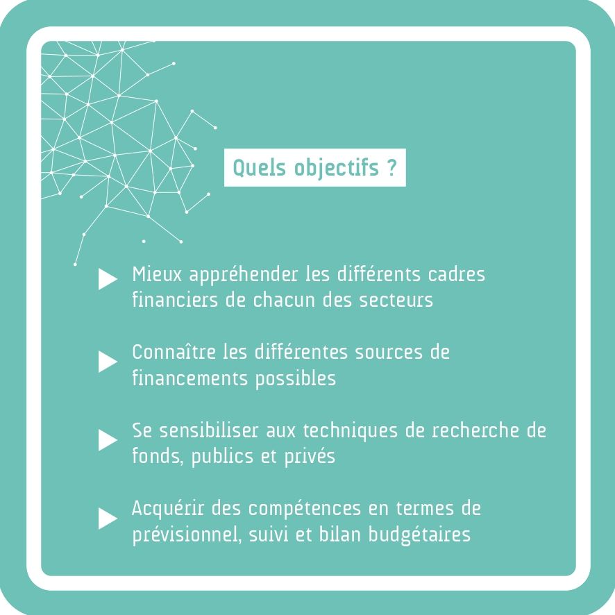 interSTICES vous propose une session de formation pour mieux appréhender les différents cadres financiers de chacun des secteurs, connaître les différentes sources de financements possibles, se sensibiliser aux techniques de recherche de fonds, publics et privés, acquérir des compétences en termes de prévisionnel,suivi et bilan budgétaires.