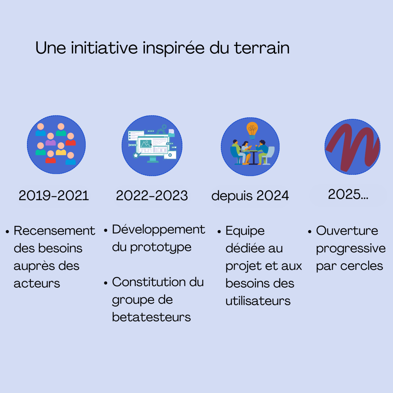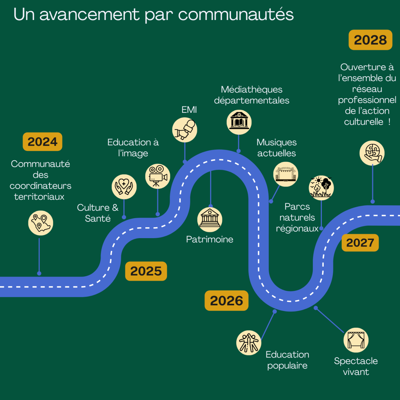 Myriade s'efforce de répondre aux besoins du secteur de l'action culturelle régionale. Son développement se fera de manière continue jusqu'en 2027. Afin de répondre au mieux aux attentes, le choix a été fait d'une ouverture par cercle de communautés dans les premières années de son développement.