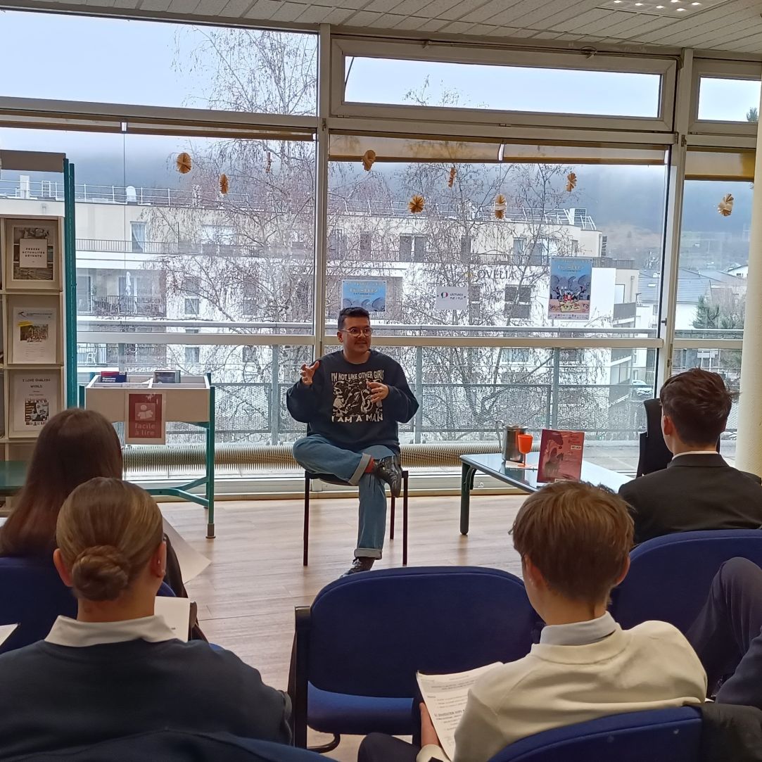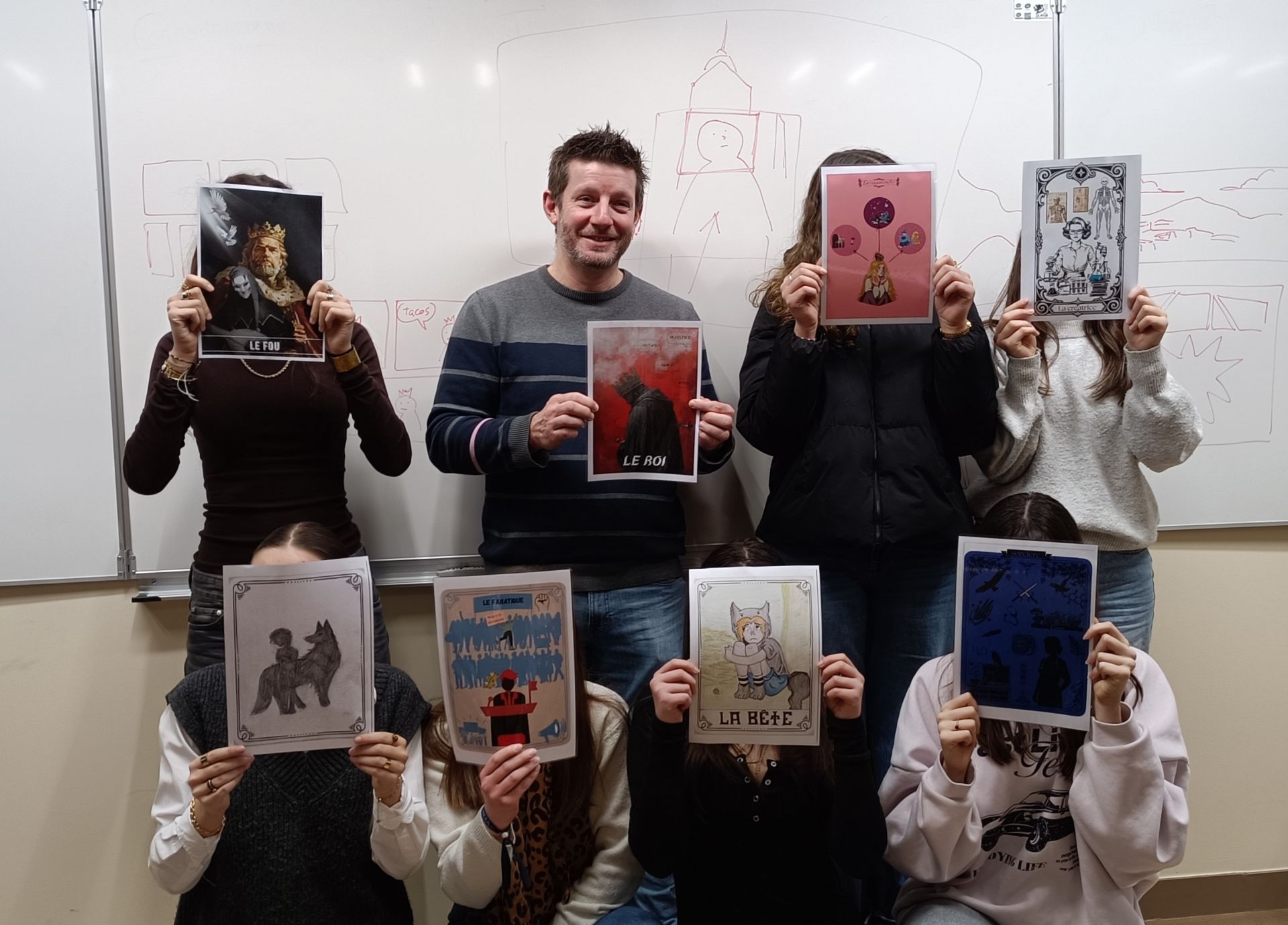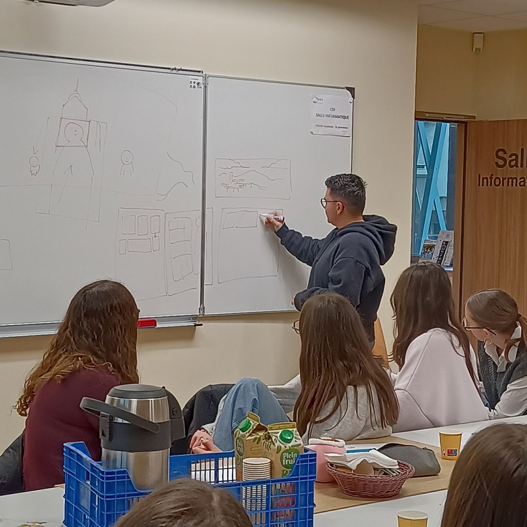 Au lycée hôtelier de Challes-les-Eaux, les élèves de 1ère pro Cuisine-Service ont présenté à Marcel Shorjian les archétypes de cartes de tarot qu'ils et elles ont imaginé puis imagé, avant de poursuivre la rencontre avec des questions portant sur le contenu de la BD et le métier d'auteur-illustrateur. Les échanges ont ensuite continué jusqu'à la dernière minute des dédicaces !