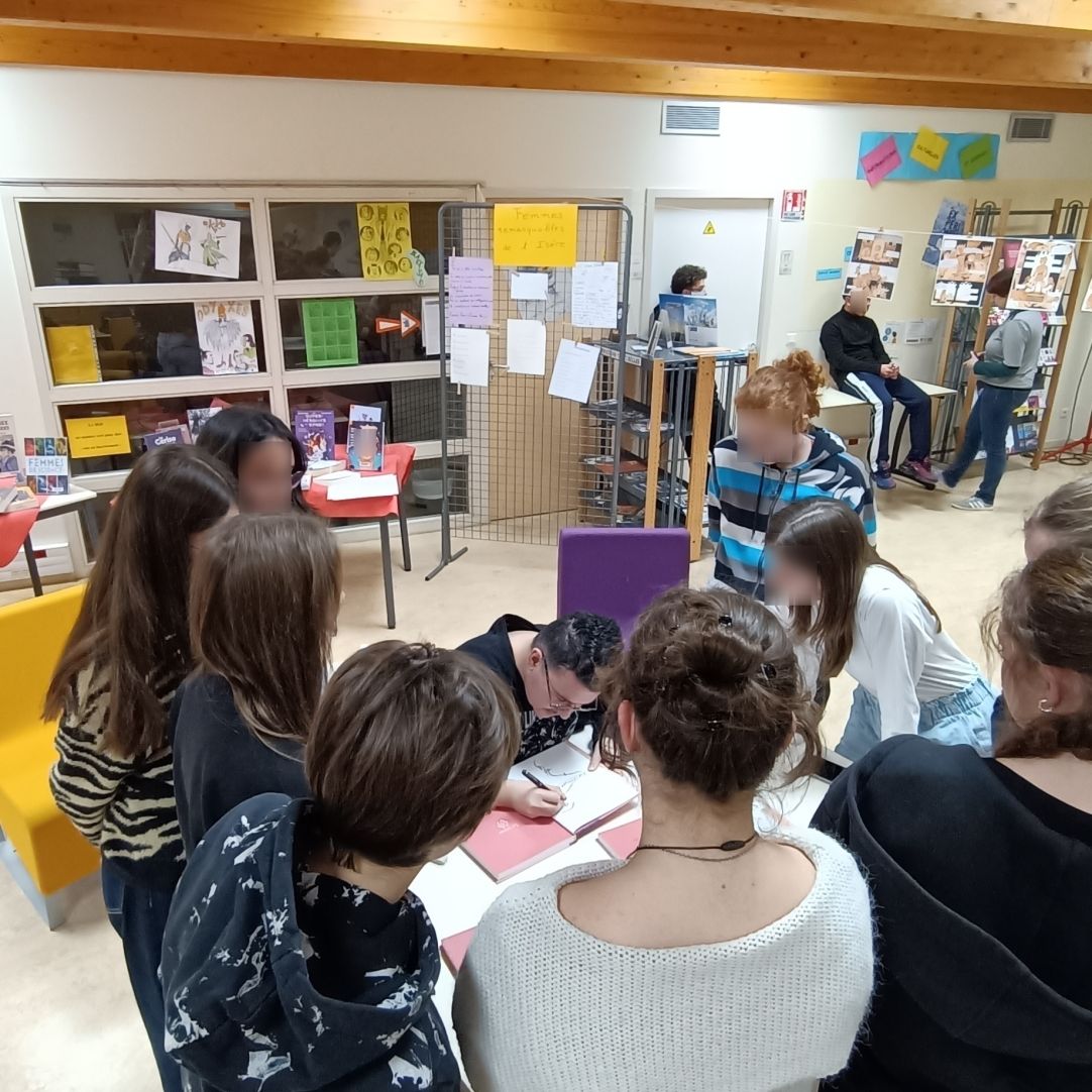 La tournée de Marcel Shorjian a pris fin en beauté au lycée Marie Reynoard de Villard-Bonnot ! Les élèves de 2nde ont redoublé de créativité pour accueillir l'auteur : adapatation théâtrale de certains passages d'Adieu mon royaume, réalisation de planches de BD, théâtre d'ombres chinoises... Une très belle rencontre, qui s'est close par un temps d'échange informel au moment des dédicaces.