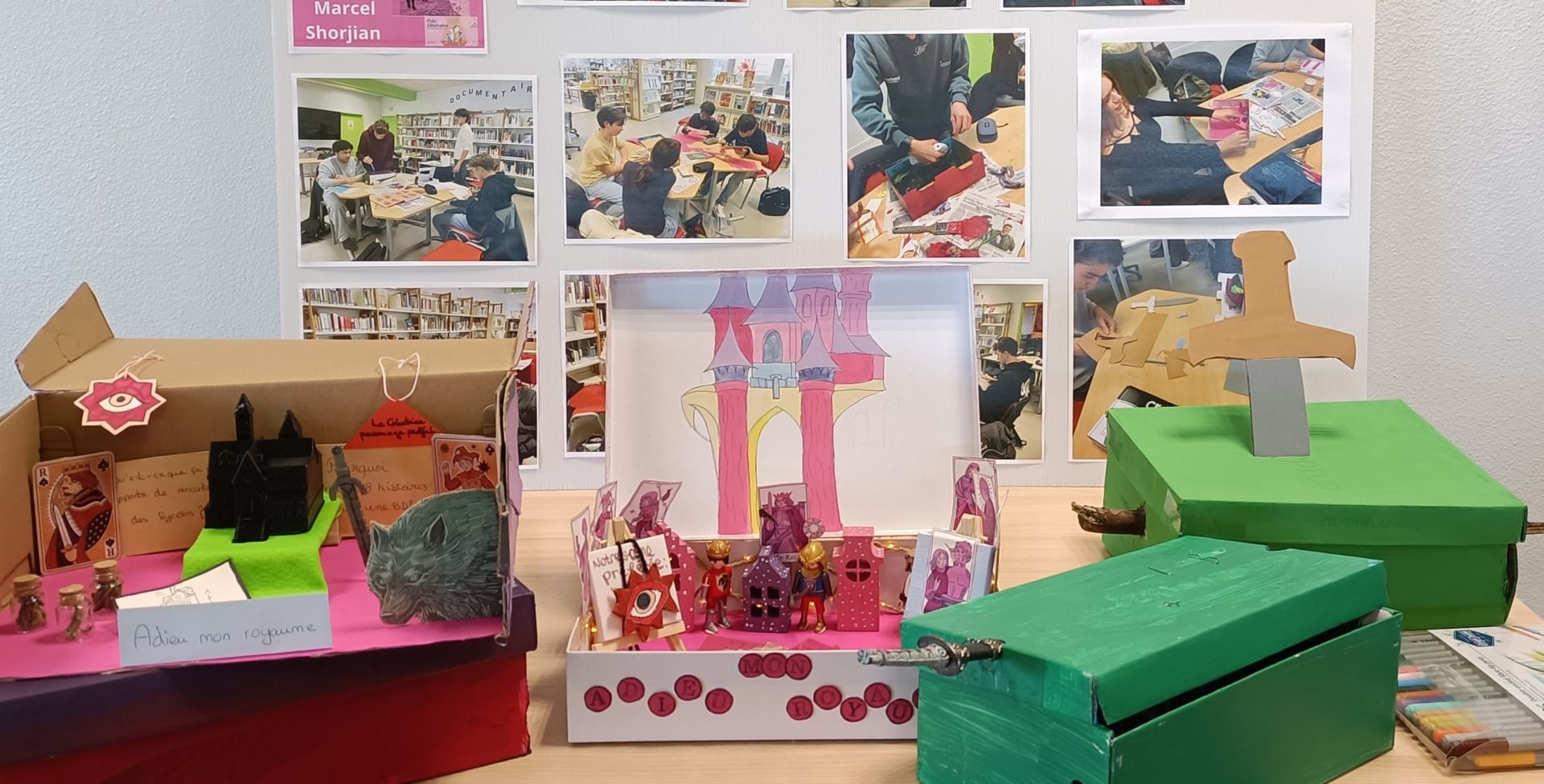 Les élèves de 2nde générale du lycée Algoud-Laffemas de Valence ont réalisé des boîtes à lecture autour de la BD de Marcel Shorjian. Chaque groupe a pris le temps de présenter son travail à l'auteur, puis de l'interroger sur les thématiques d'_Adieu mon royaume _et le travail d'illustrateur. Bravo aux élèves pour leur belle créativité !