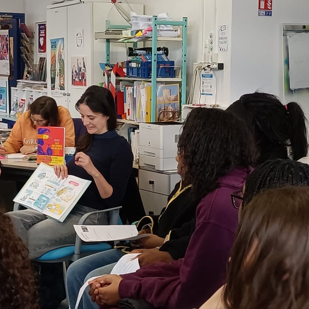 La rencontre avec les élèves de Tle HLP du lycée Jean-Paul Sartre de Bron s'est ouverte par une projection du booktube réalisé par les élèves autour de la BD Meufs : un guide pour nos filles. Elles s'est ensuite poursuivie par un temps de questions et d'échanges autour du métier d'autrice-illustratrice, ainsi qu'aux questions d'égalité de genre.
