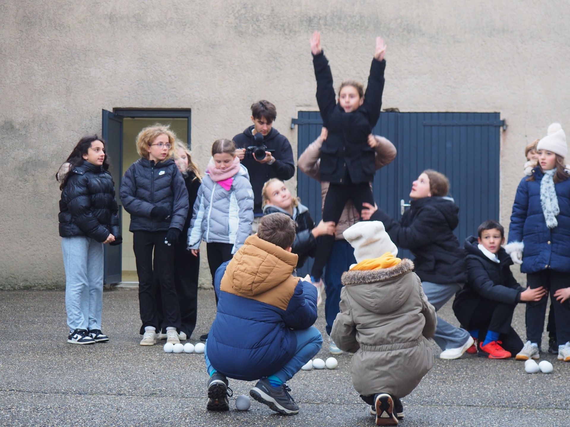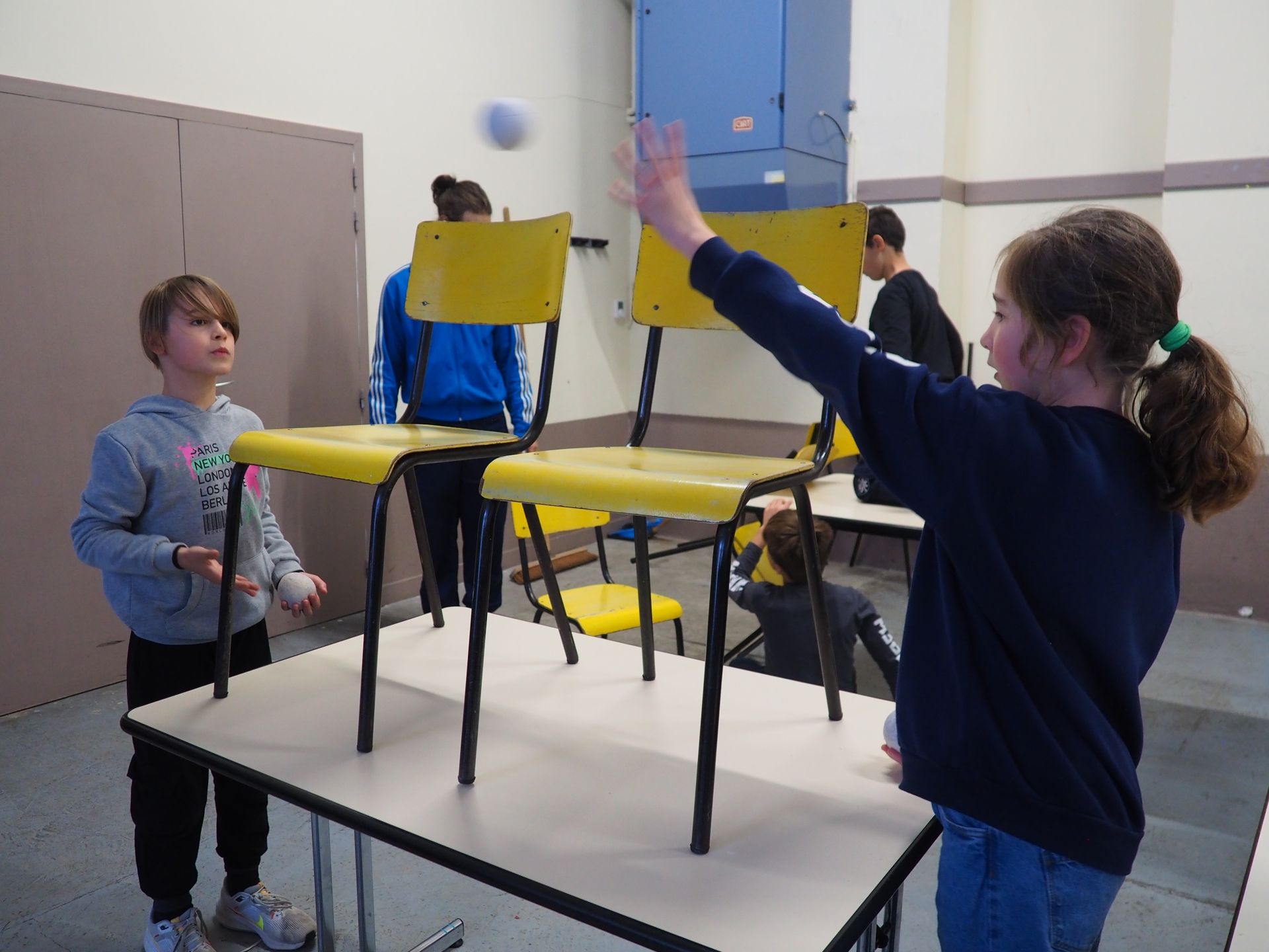 Au fil des séances, les élèves ont découvert différentes disciplines circassiennes adaptées à leur âge — équilibre, manipulation d’objets, jonglage, portés acrobatiques — tout en explorant les étapes du processus de création artistique. Les plus jeunes ont suivi un parcours mêlant cirque et oralité, mettant en gestes des poésies étudiées en classe à l’aide d’une balle, travaillant ainsi le rythme, la coordination et l’expression. Les plus grands ont investi les différents espaces de l’école pour expérimenter le mouvement, la scénographie et la relation au public, transformant leur environnement quotidien en véritable terrain de jeu artistique.
