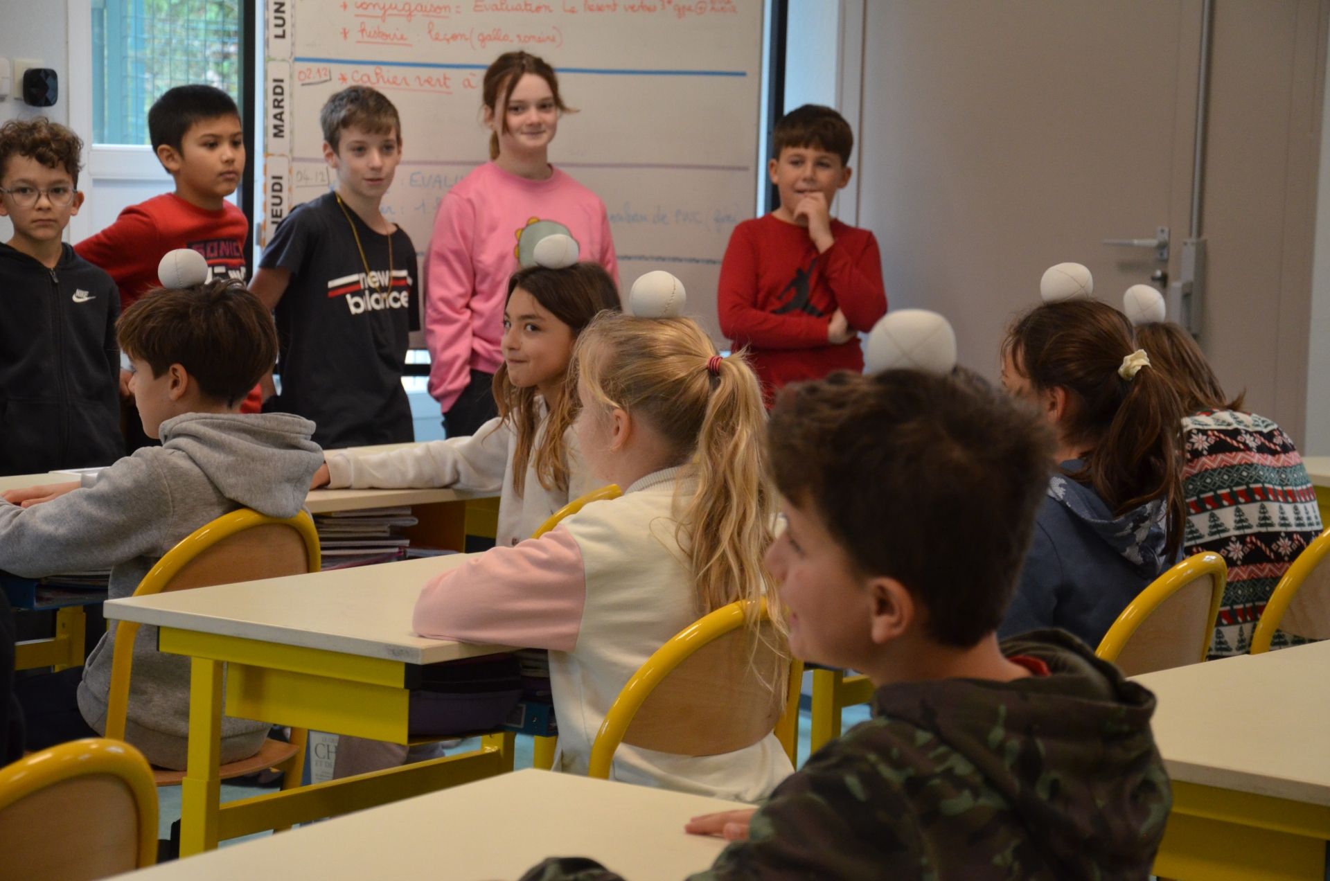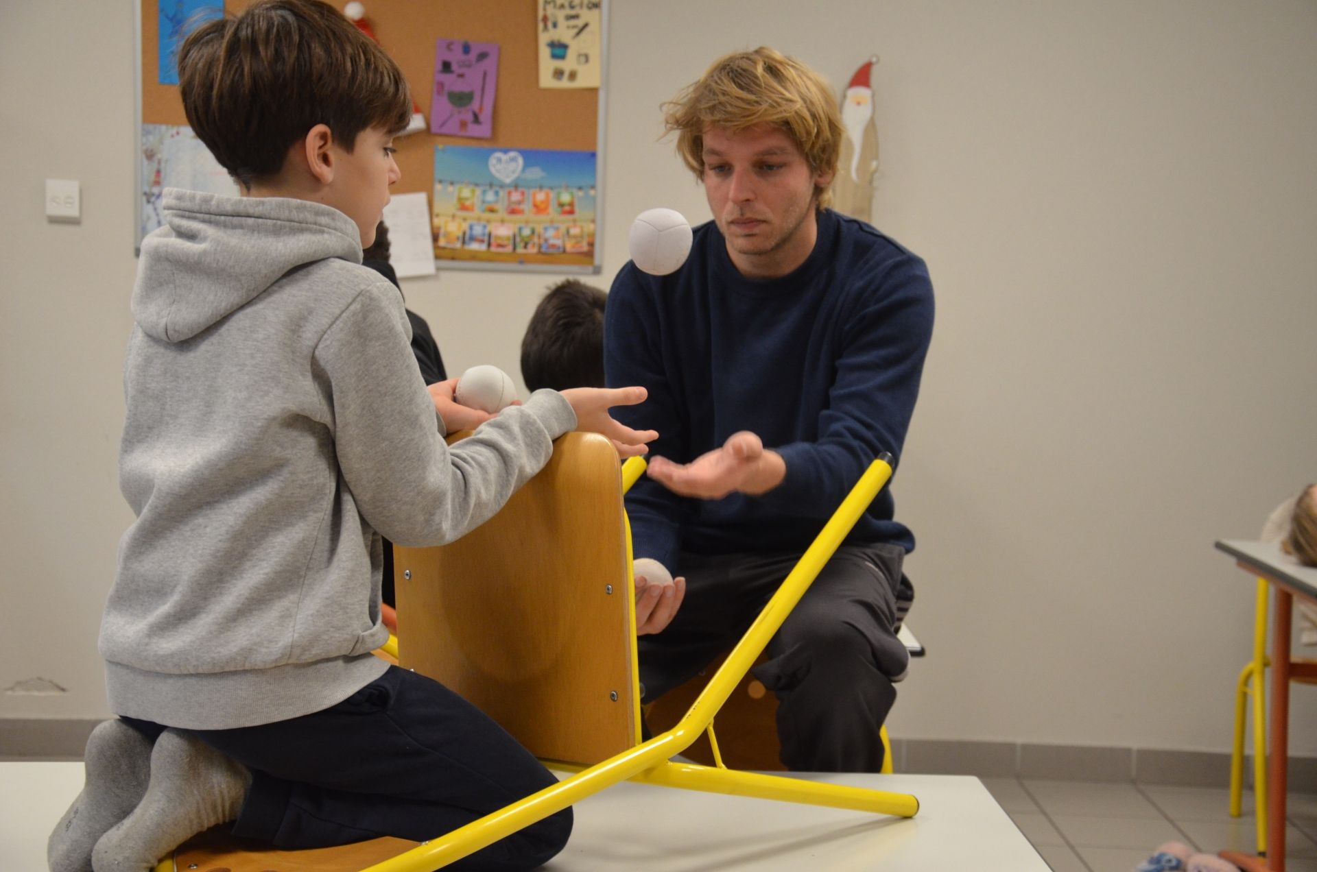 Les élèves de CE2-CM2 ont, quant à eux, approfondi le travail autour du jonglage, des équilibres et des portés acrobatiques, accompagnés par Tristan Curty, Pablo Courtès et Lucien Coignon. Ils ont investi différents espaces de l’école afin d’expérimenter les techniques circassiennes dans des contextes variés et de concevoir de courtes scénettes en musique. Ces propositions ont été pensées pour être présentées lors d’une déambulation artistique, invitant camarades et parents à porter un autre regard sur les lieux du quotidien.