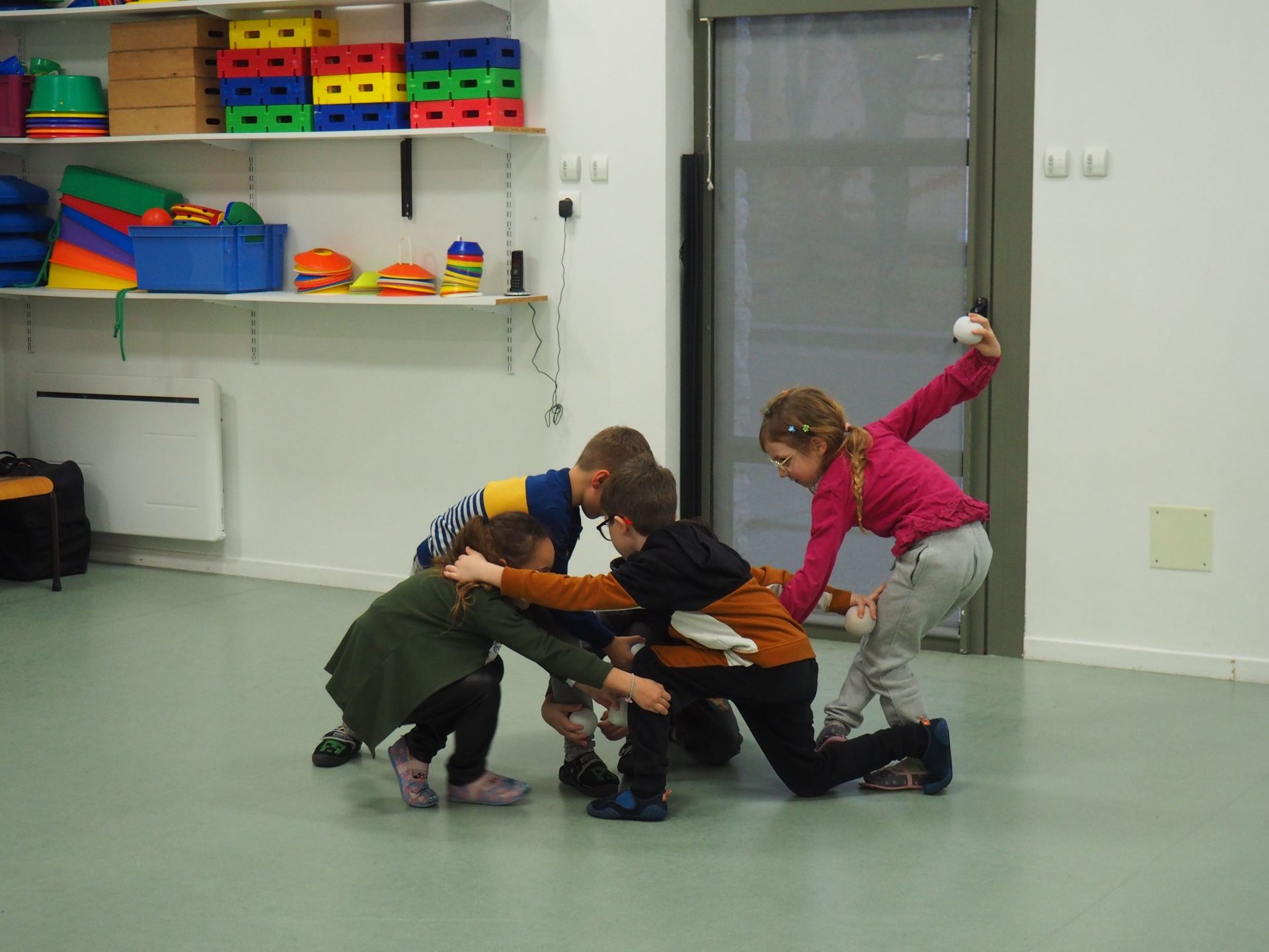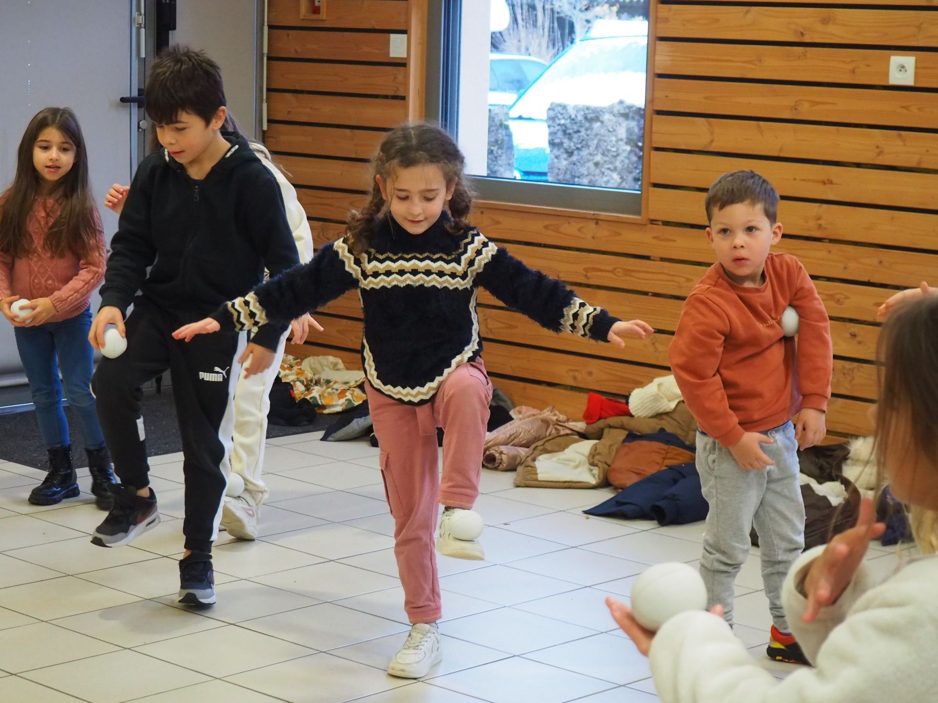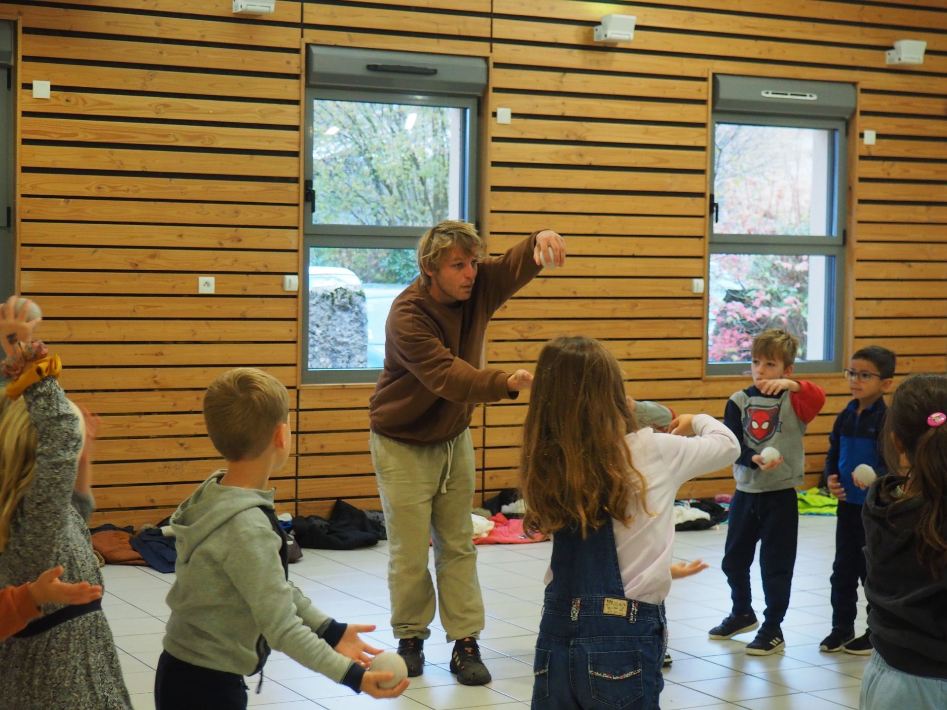 Accompagnés par Lucien Coignon, les élèves de CP-CE1 ont expérimenté, en solo, en duo et en groupe, la manipulation de balles de jonglage ainsi que différentes formes d’équilibres. Le travail corporel est venu enrichir la mise en voix de poésies sur le thème de l’automne : les gestes ont prolongé le texte, permettant aux élèves d’explorer le rythme, l’espace et l’expression par le mouvement.