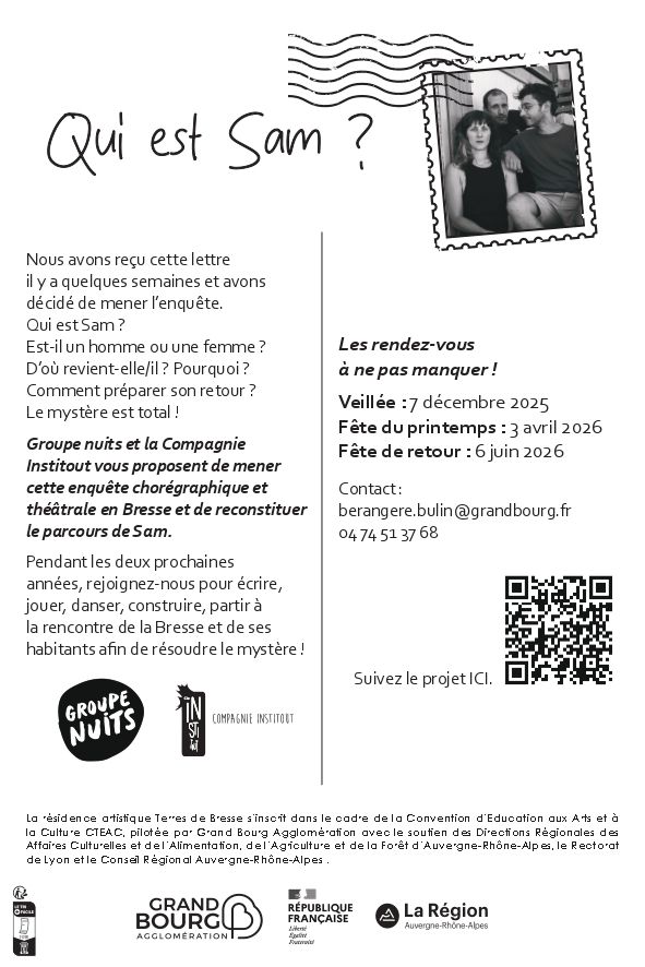 Ensemble, ils ont imaginé une vaste enquête à mener avec les habitants pour reconstituer l’histoire de Sam. Ce personnage fictif a quitté sa Bresse natale, mais souhaite y revenir. Son retour sera marqué par une grande fête à son image. Les artistes invitent les habitants à l’organiser.