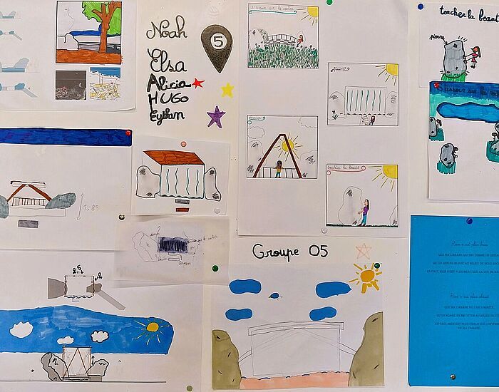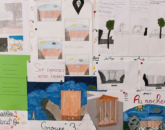 Le projet a réuni 25 élèves de CM1-CM2 de l’école de St-Jean-St-Maurice-sur-Loire et six salariés des Ateliers de la Récup’. Répartis en 5 groupes, ils ont été accompagnés par Jonathan Pailleux, architecte à Saint-Etienne (cabinet Gali Architecte) avec pour objectif d’imaginer une cabane et son implantation parmi des sites sélectionnés dans le village.