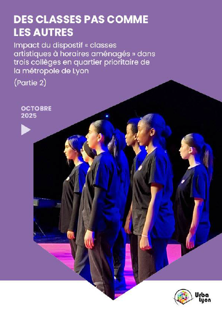 L’Agence d’urbanisme de Lyon a mené une étude sur le potentiel transformateur des classes artistiques à horaires aménagés, dans 3 collèges prioritaires de la métropole de Lyon : la classe CHAAP (arts plastiques) du collège Jean-Mermoz à Lyon 8e, la classe CHAT (théâtre) du collège Aimé-Césaire à Vaulx-en-Velin et la classe cinéma du collège du cinéma Bertrand-Tavernier à Villeurbanne. L’étude s'appuie sur une analyse des résultats scolaires des élèves concernés, des évolutions sociales et humaines, du maintien de la mixité sociale, de l’évolution du projet d’établissement en lien avec le dispositif et de l’investissement demandé aux institutions culturelles du territoire. Les résultats font apparaître cette politique publique comme un levier éducatif, artistique et territorial puissant au service de la réduction des inégalités culturelles et sociales dans les collèges en quartiers prioritaires analysés. Cette étude préfigure une troisième partie prévue en 2026, qui aura pour objectif de modéliser le dispositif métropolitain afin de consolider une culture commune du dispositif dans le cadre d’un cofinancement par la Métropole de Lyon.